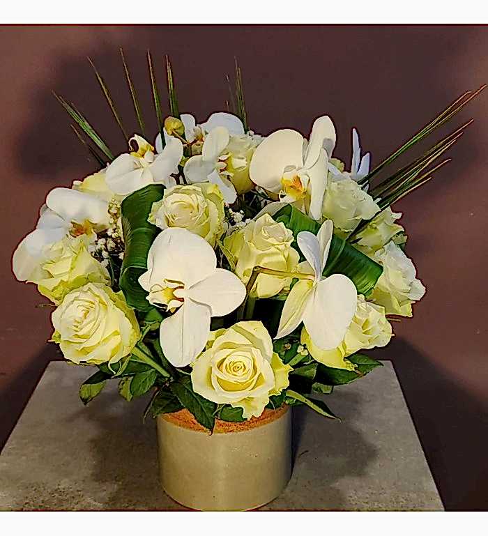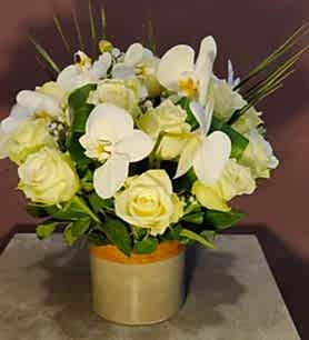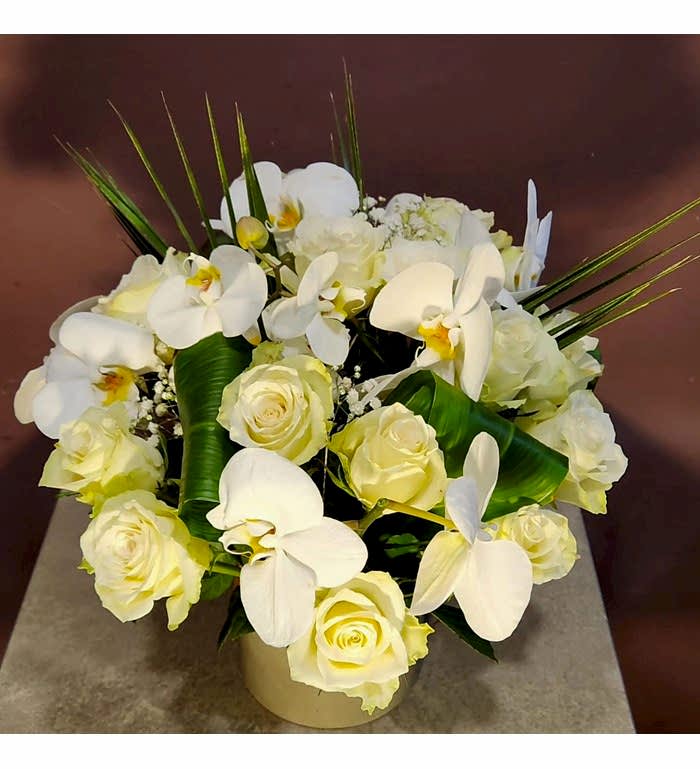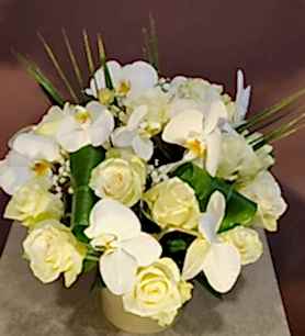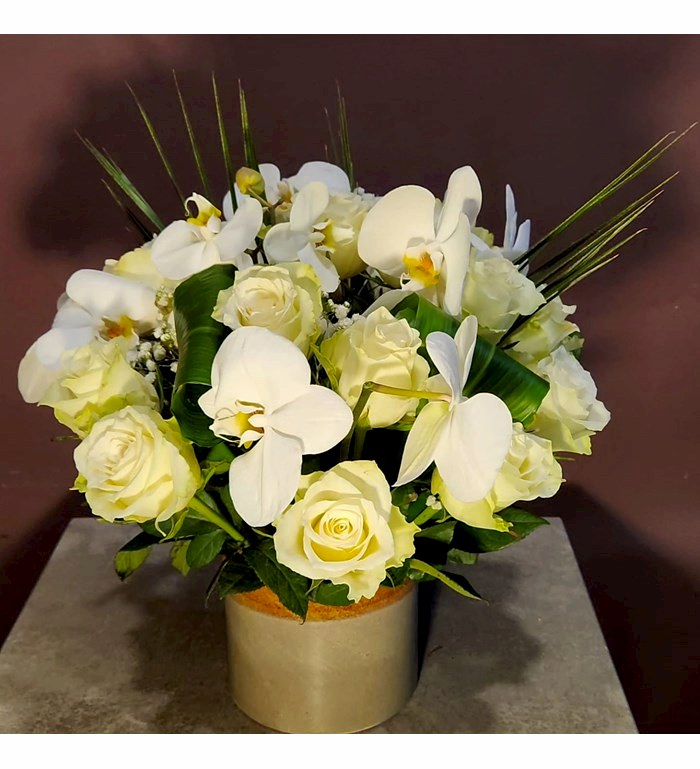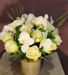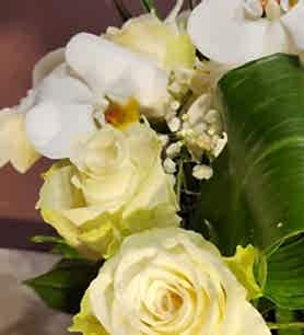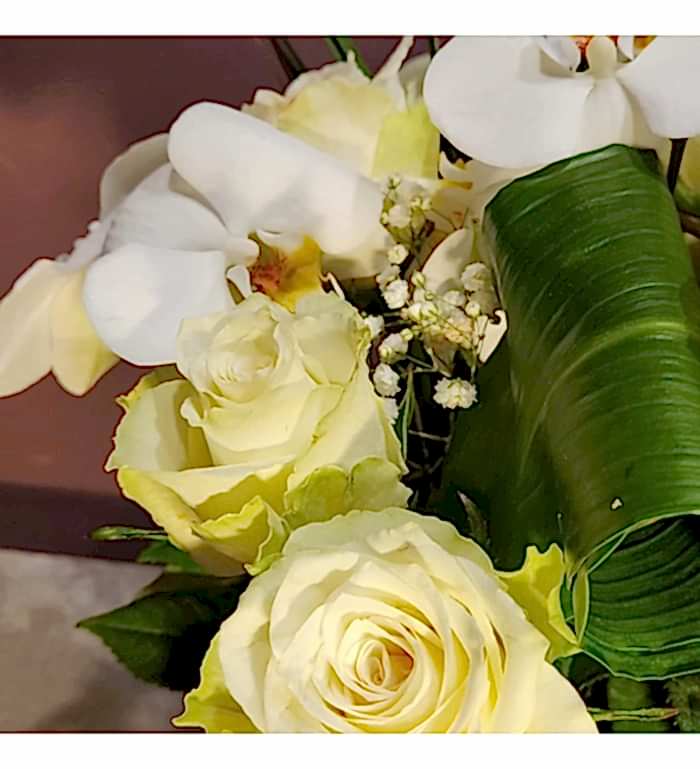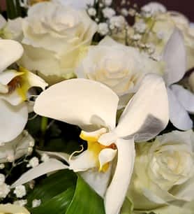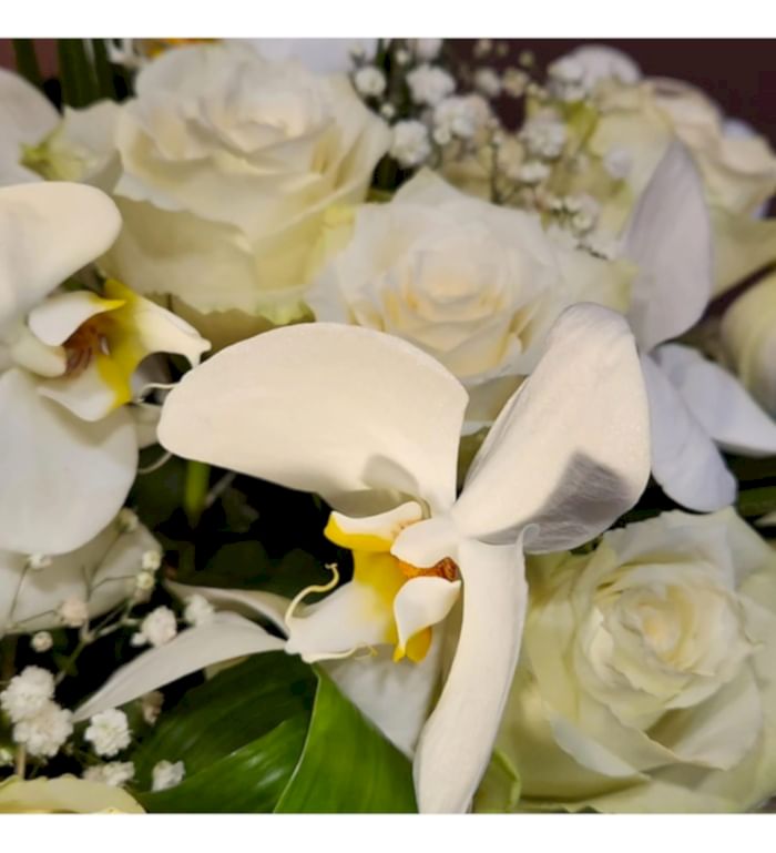İçerisinde beyaz güller beyaz orkideler ve yeşillikler bulunmaktadır.