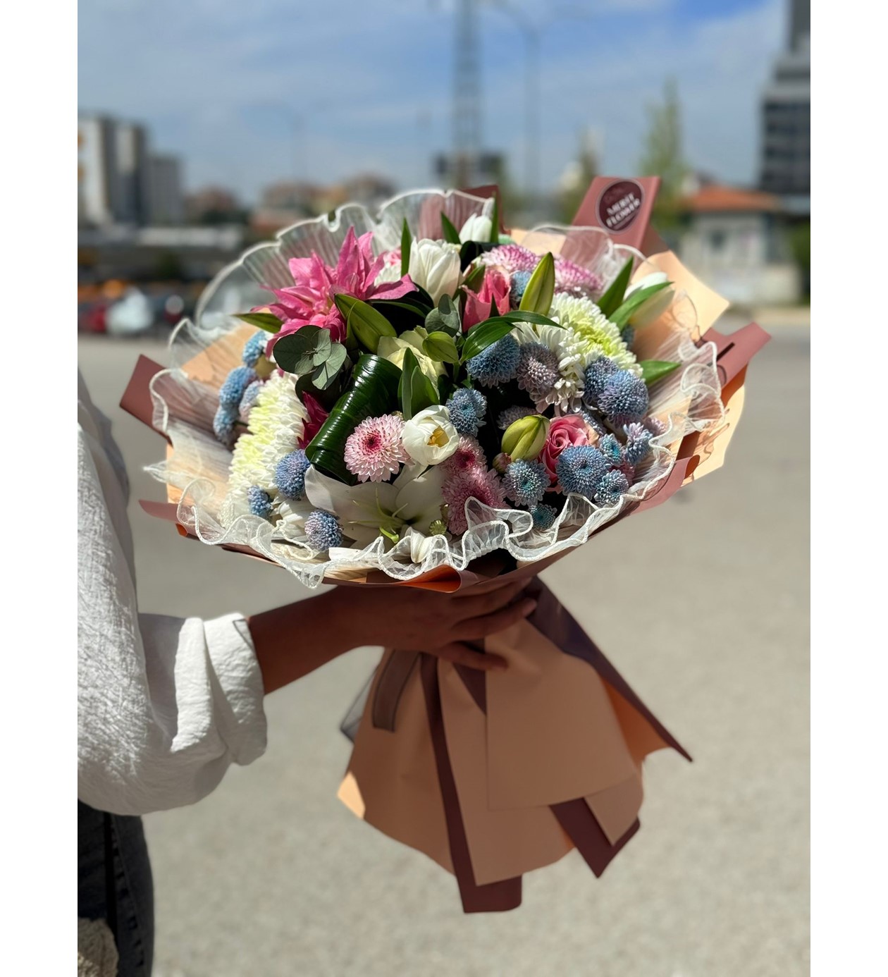 Kendini özel hissedenlere ve sevdiklerine o duyguyu hissettirmeyi sevenlere özel hazırlanan bu buket; zarif renk uyumu, taze çiçek seçimleri ve modern tasarım dokunuşlarıyla öne çıkan premium bir aranjmandır. Hem romantik jestler hem de özel günler için ideal olan bu çiçek buketi, doğal güzelliği ve şık duruşuyla duyguları en sofistike şekilde ifade eder. Ankara içi aynı gün teslimat ile sevdiklerinize unutulmaz bir sürpriz yapabilirsiniz.