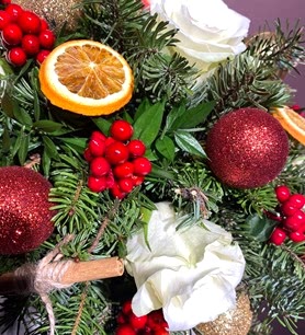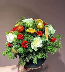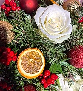 Şık vazo içerisinde kokinaların ve beyaz güllerin yer aldığı aranjmanda bulunan tüm ürünler mevcuttur.