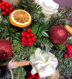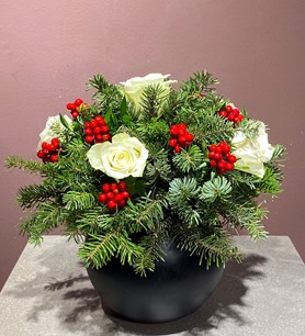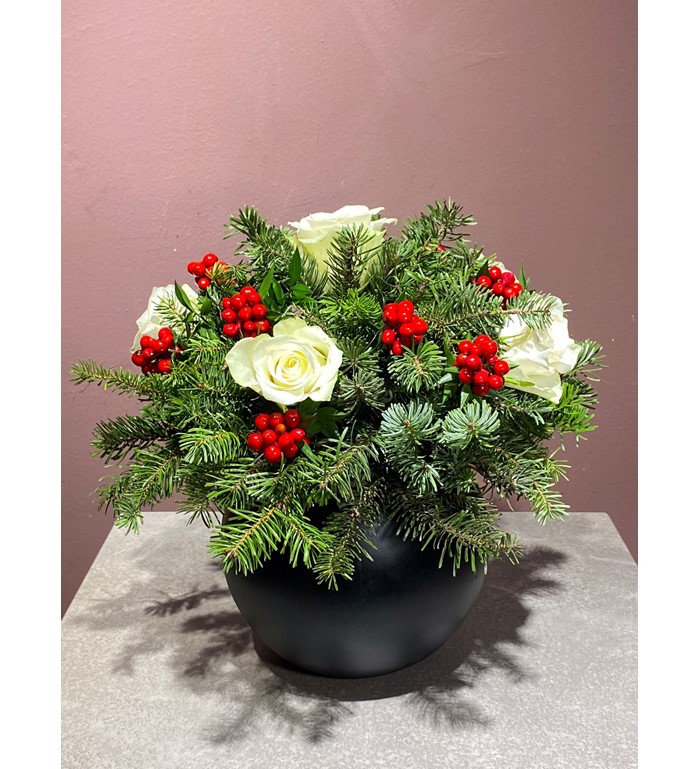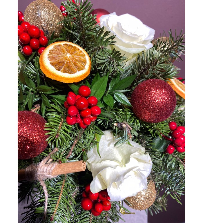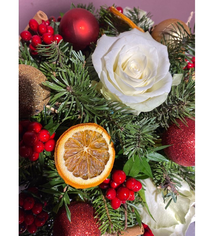 Şık vazo içerisinde kokinaların ve beyaz güllerin yer aldığı aranjmanda bulunan tüm ürünler mevcuttur.