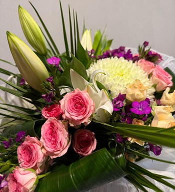 Beyaz kazablanka, pembe ve turuncu güllerin sıcak tonlarıyla,